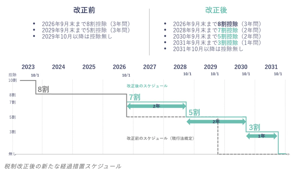 インボイス未登録事業者と取引を行った場合、取引先(買い手)が仕入税額控除を段階的に受けられる「経過措置」についても、控除割合を段階的に下げていくスケジュールが後ろ倒しされる見込みです。