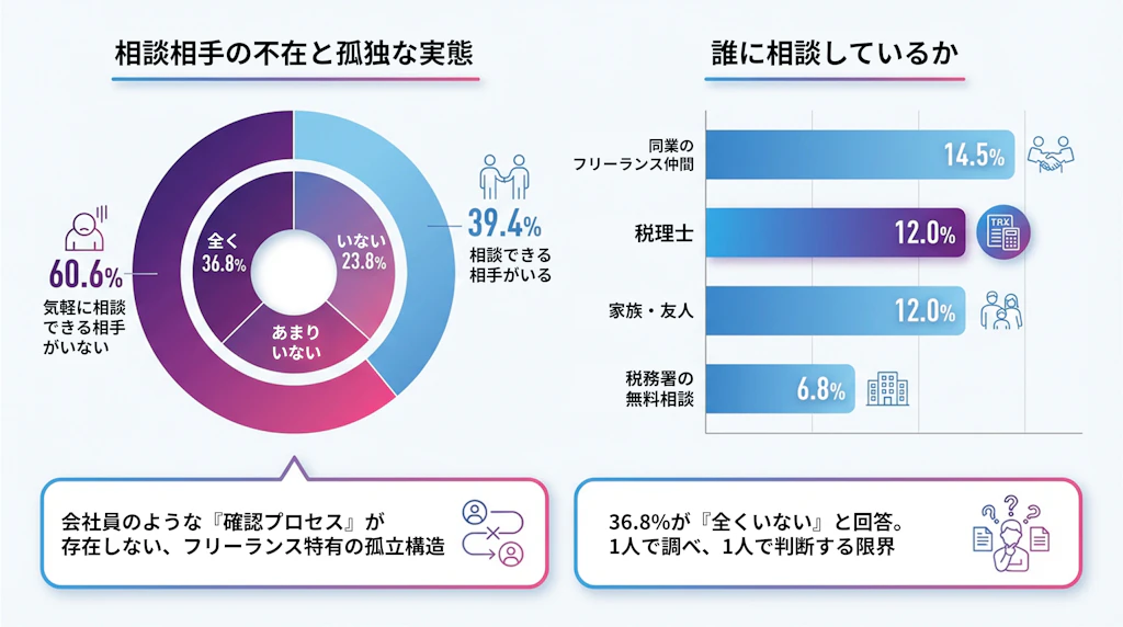 この結果は、確定申告の負担が単なる手続きの難しさだけでなく、「相談環境の不足」によってさらに大きくなっていることを示しています。会社員であれば、給与計算や税務処理に関して社内の経理担当や制度を通じて確認できる環境が整っていますが、フリーランスにはそのような確認プロセスが存在しません。そのため、疑問点が生じても自分で調べて判断するしかなく、「確認できない状態」で作業を進めることが常態化しやすい特徴があります。