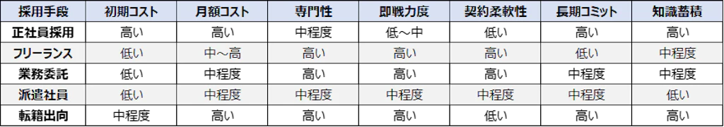 また、正社員採用だけでなく、フリーランスや業務委託といった多様な採用手段を組み合わせることで、より柔軟で効果的な人材確保が可能になります。特に、プロジェクトの性質や緊急度に応じて最適な採用手段を選択することで、コスト効率と成果の両立を実現できます。