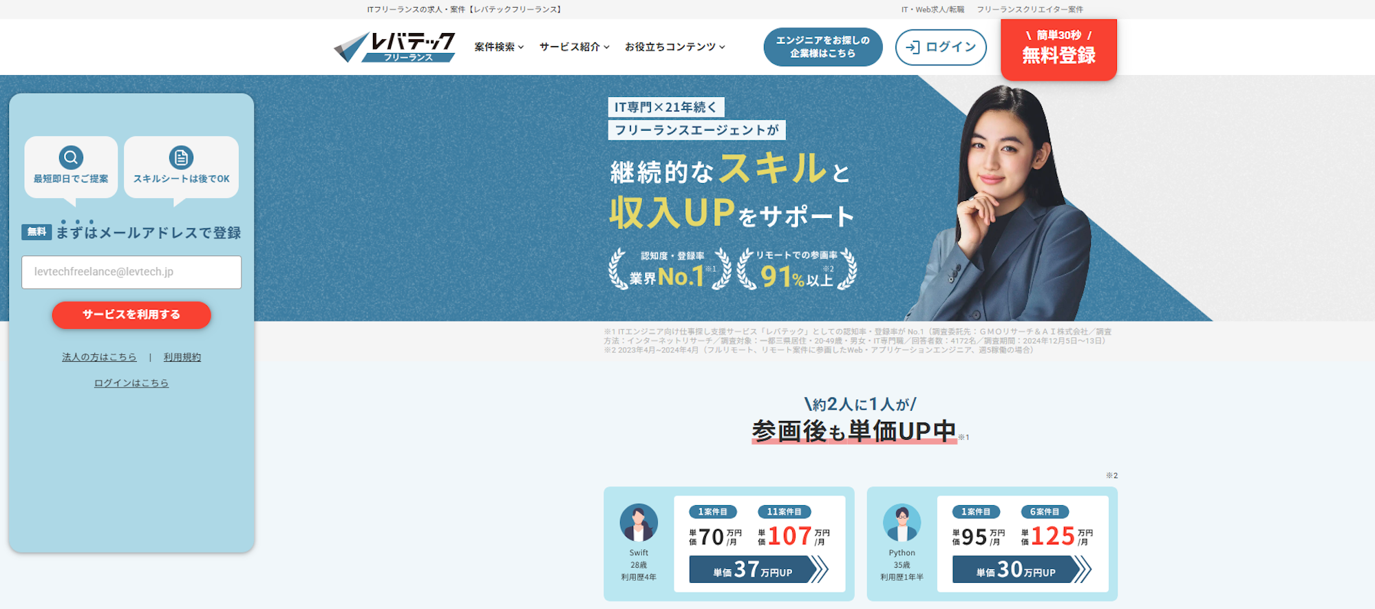 元請けや商流の浅い案件を多く扱うため高単価案件を提案できる点が特徴です。専任エージェントが案件紹介から参画後のフォロー、報酬交渉までサポートし、契約更新や次案件の提案など継続的なキャリア支援も行っています。