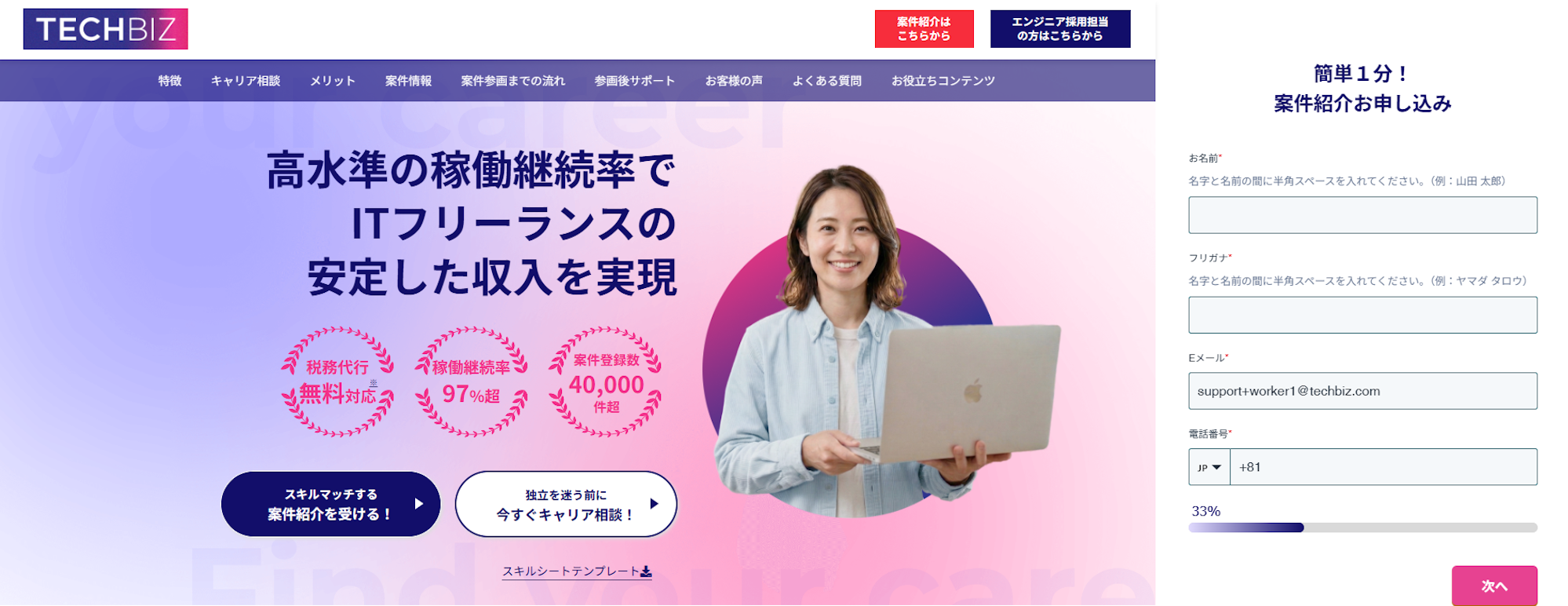 IT業界を熟知した営業担当が直接カウンセリングを行い、希望条件やスキルに合った案件を精度の高いマッチングで提案。参画後のフォローまで一貫してサポートするほか、税理士紹介などフリーランス向けの支援サービスも充実しています。