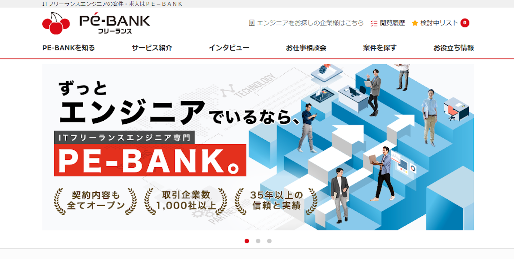 「PE-BANK」は、30年以上の実績を持ち、全国の企業と取引しながらWeb・業務系システム開発など幅広い案件を紹介しています。