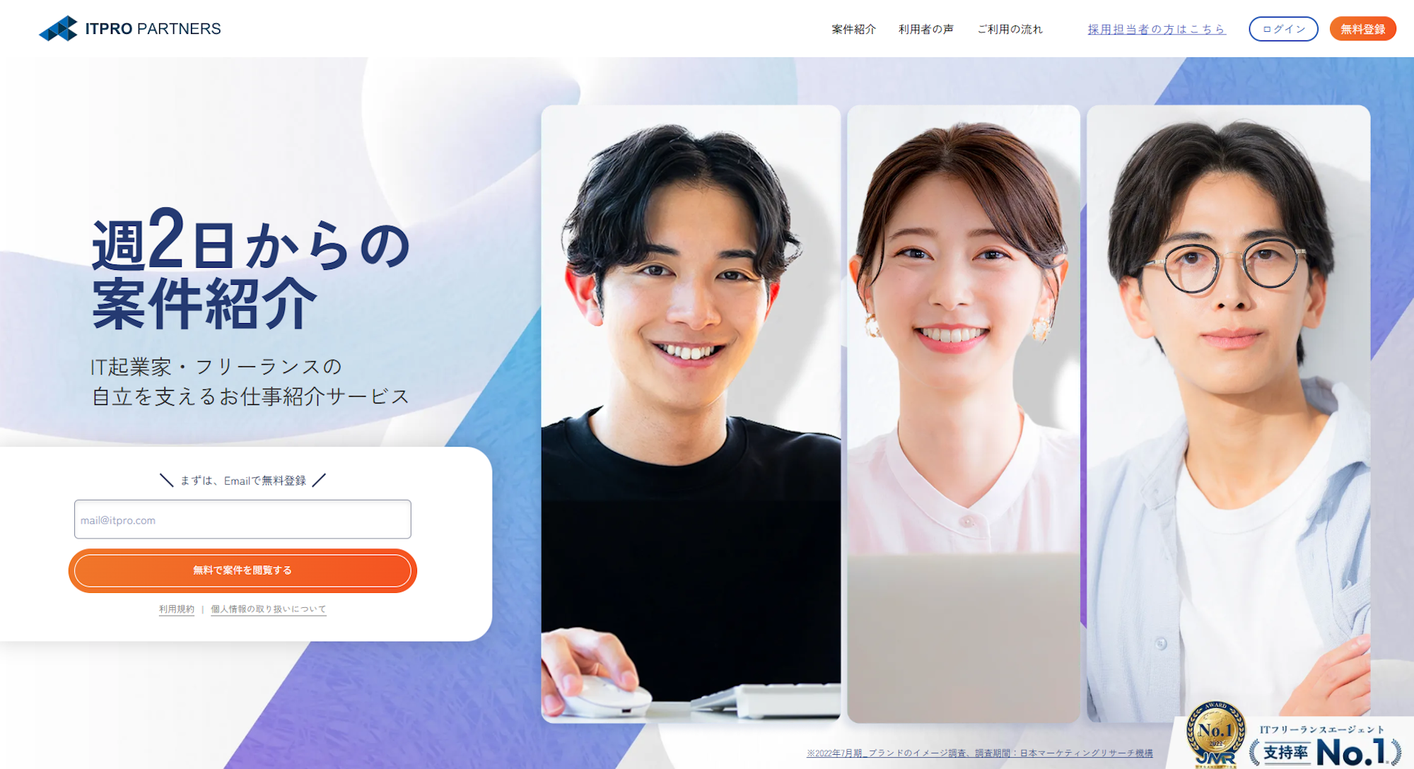 「ITプロパートナーズ」は、エンジニアを中心に、マーケターやデザイナー、PMなど幅広い職種の案件を扱っており、週2〜3日から参画できる柔軟な稼働案件が多い点が特徴。