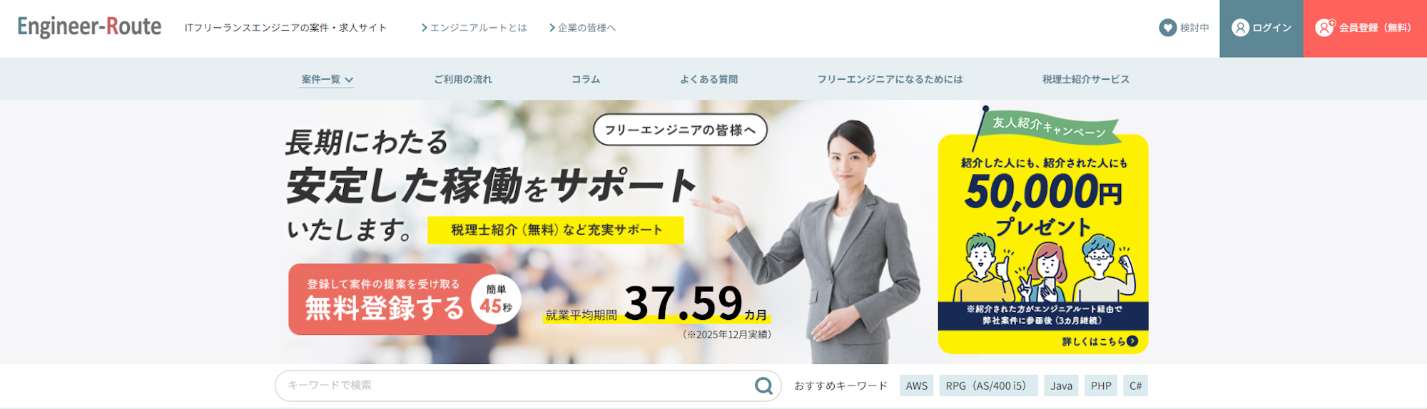 「Engineer-Route」は、IT・Web開発を中心に、インフラやPM・デザイナーなど幅広い職種の案件を取り扱っており、大手企業からベンチャーまで多様なプロジェクトに参画できます。