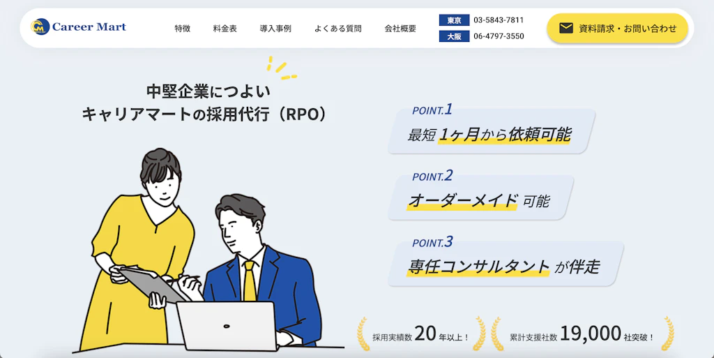 キャリアマートのRPOは、応募者対応やスカウト配信、日程調整などの採用実務を中心に代行するサービスです。20年以上・19,000社以上の支援実績をもとに、企業ごとの採用状況に合わせた運用体制を構築します。