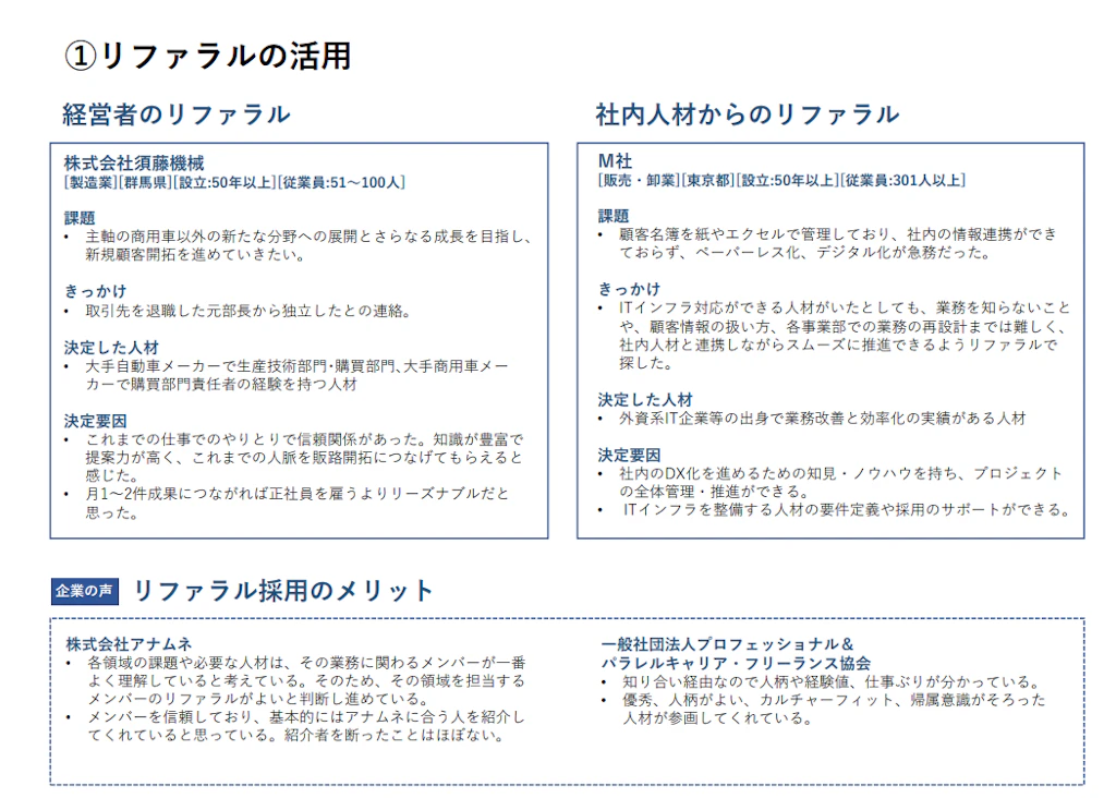なお資料のタイトルには“兼業・副業”とありますが、内容を読み解いていくとそれだけに留まらず、リファラルについてはもちろん、経営課題解決における人材へのアプローチなどを含めた手法や活用事例などがまとめられています。