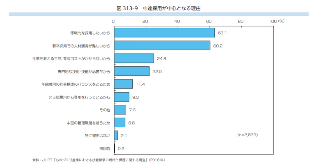 その傾向は、ITのみならず多くの業界にあります。たとえば、経済産業省が公開している資料「ものづくり人材の確保と育成」のデータでは、中途採用が中心となる理由に“即戦力を採用したいから”という回答が最も多く集まっています(※2018年調査時)。