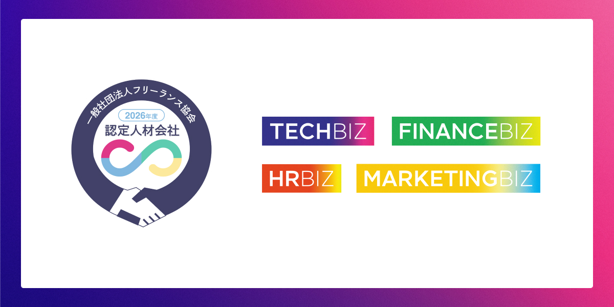 こうした背景のもと、テックビズは「働き方を変え、世界を変えていく」をスローガンに、TECHBIZ(ITエンジニア)・HRBIZ(人事・HR)・FINANCEBIZ(経理・財務)・MARKETINGBIZ(マーケティング)の4領域でフリーランスエージェントサービスを展開しています。専任コンサルタントがスキル・カルチャーフィットの両面からマッチングを行い、稼働後の定着まで見据えた支援により、企業・フリーランス双方が安心して長期的な協働関係を築けるようサポートしています。